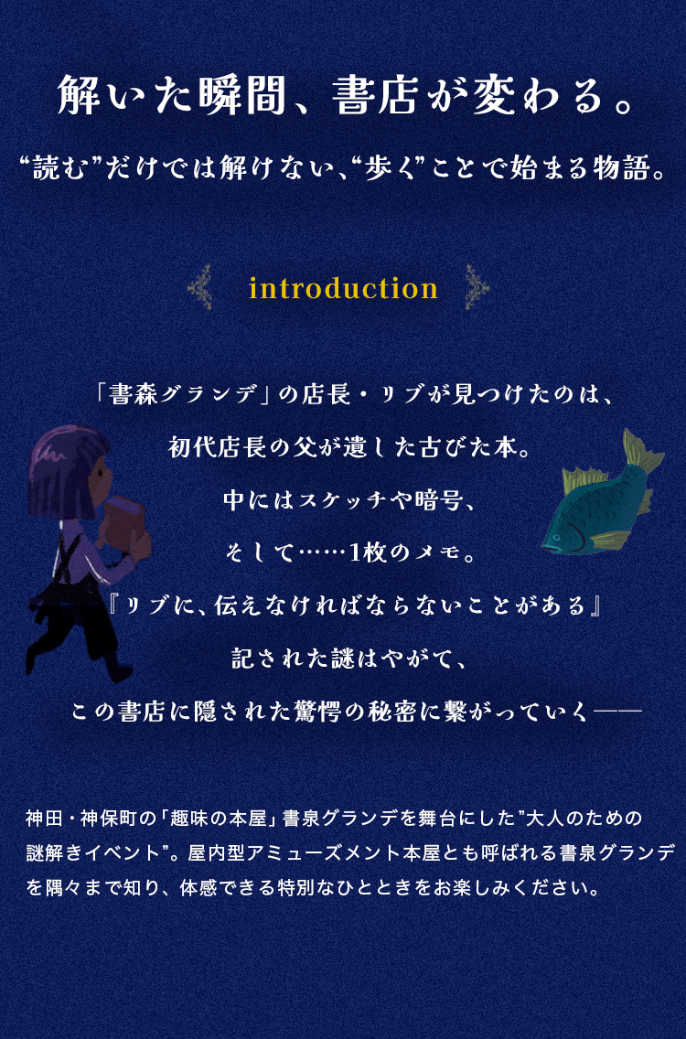 「異世界への入り口」になる舞台となるのは実際に営業している書店の店内。本を買い求める人たちの中で、謎を持つ貴方だけが見える世界をご覧あれ。