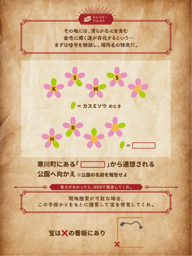暗号を解読し、「場所の名称」を突き止めよう!現地に行くことが出来ない場合、場所の名称を報告してクエストクリア!