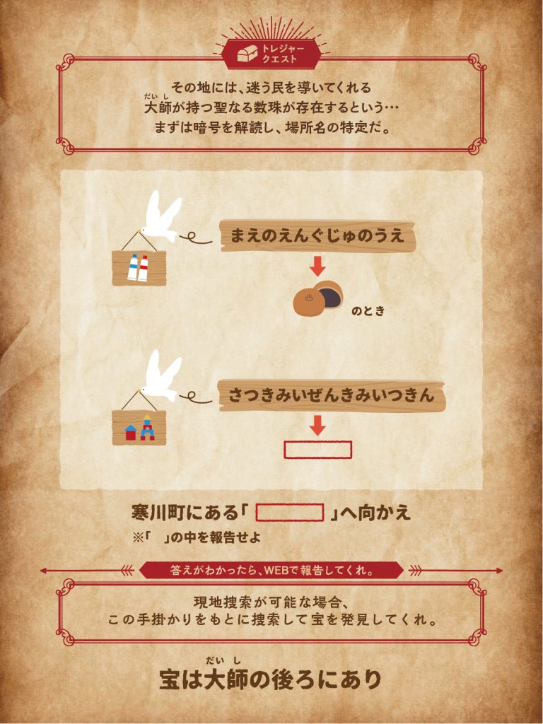 暗号を解読し、「場所の名称」を突き止めよう!現地に行くことが出来ない場合、場所の名称を報告してクエストクリア!