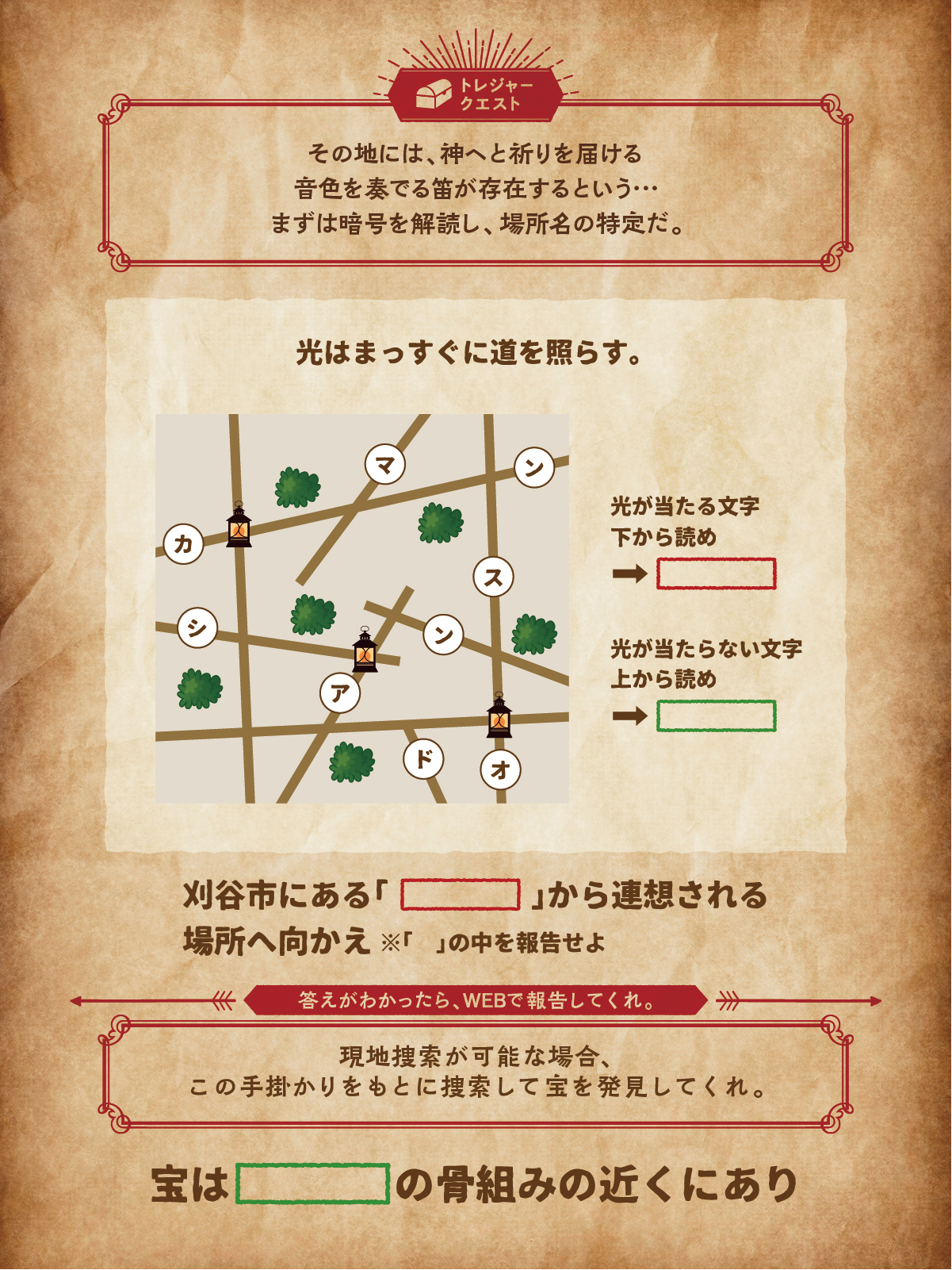 ・万が一、宝のパネルが紛失等により発見できなかった場合は、必ず隠し場所と思われる箇所の写真を撮影いただきカスタマーサポートまでご連絡ください。