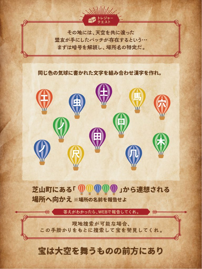 暗号を解読し、「場所の名称」を突き止めよう!現地に行くことが出来ない場合、場所の名称を報告してクエストクリア!