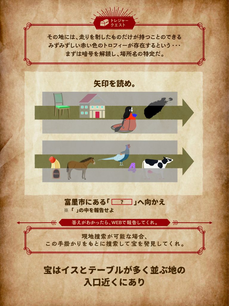暗号を解読し、「場所の名称」を突き止めよう!現地に行くことが出来ない場合、場所の名称を報告してクエストクリア!