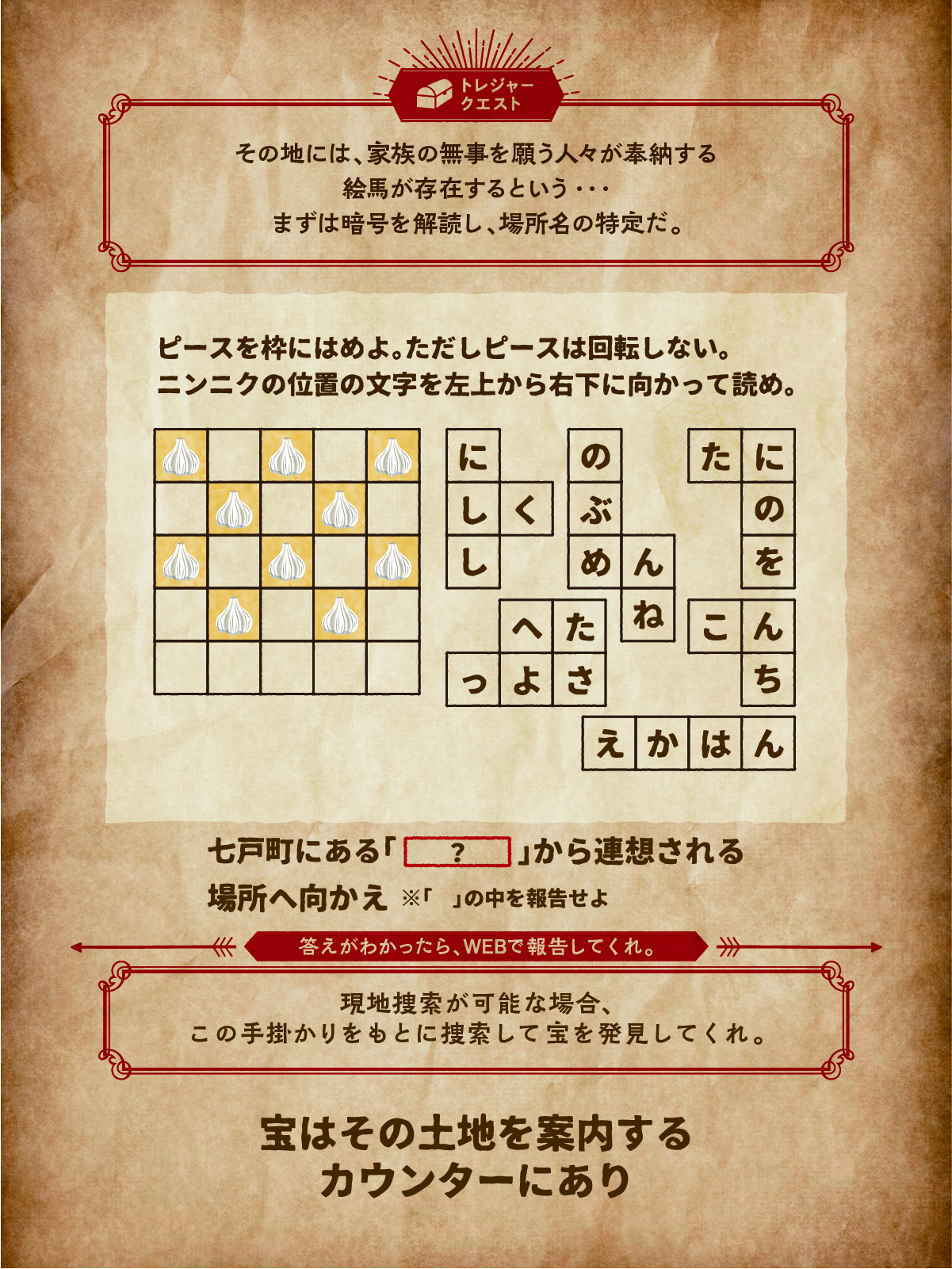 暗号を解読し、「場所の名称」を突き止めよう!現地に行くことが出来ない場合、場所の名称を報告してクエストクリア!
