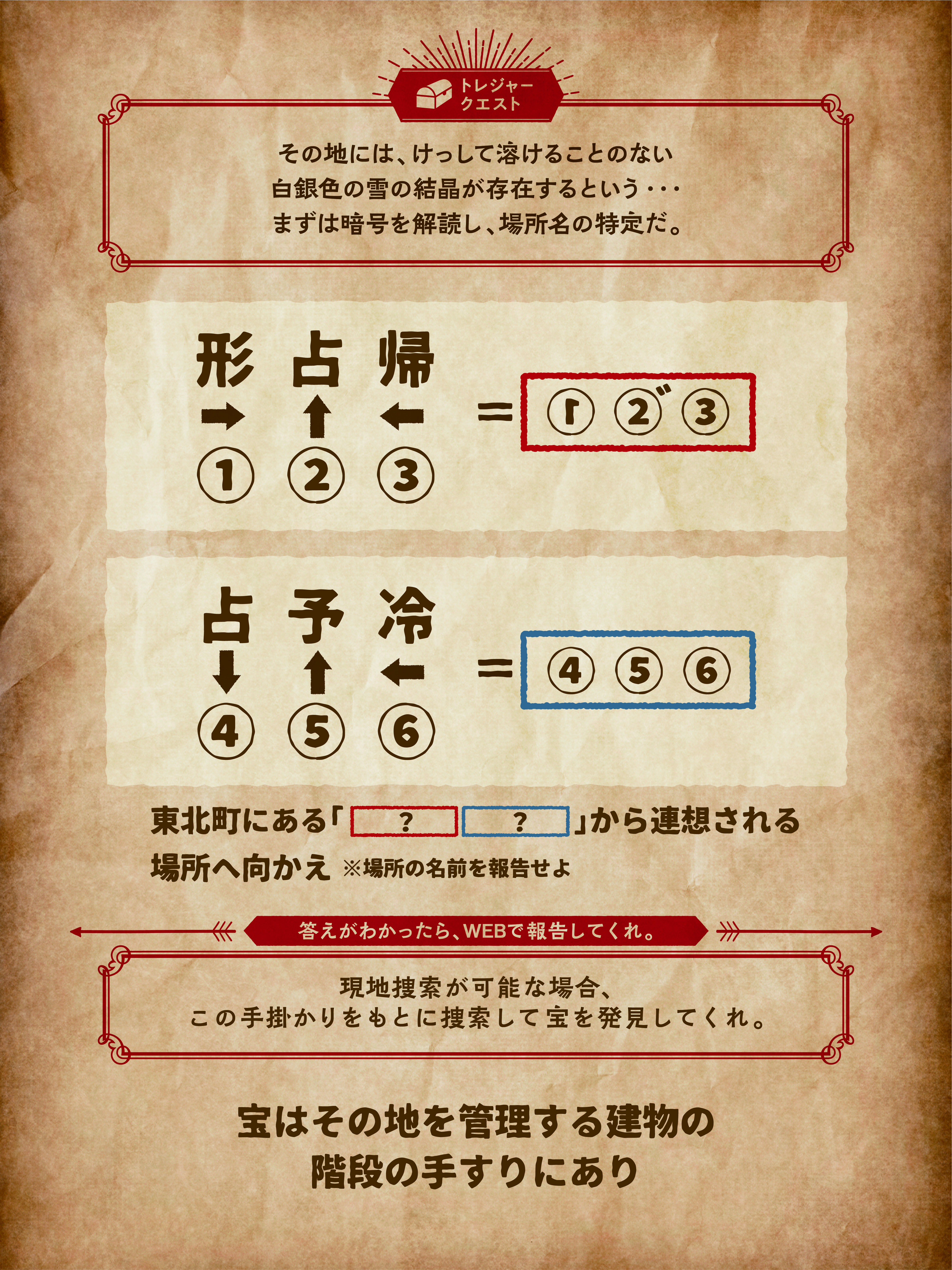 暗号を解読し、「場所の名称」を突き止めよう!現地に行くことが出来ない場合、場所の名称を報告してクエストクリア!