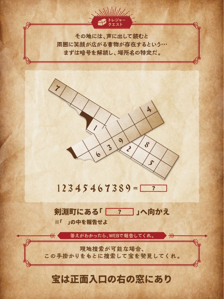 暗号を解読し、「場所の名称」を突き止めよう!現地に行くことが出来ない場合、場所の名称を報告してクエストクリア!