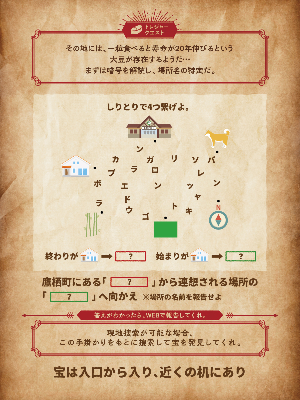 暗号を解読し、「場所の名称」を突き止めよう!現地に行くことが出来ない場合、場所の名称を報告してクエストクリア!