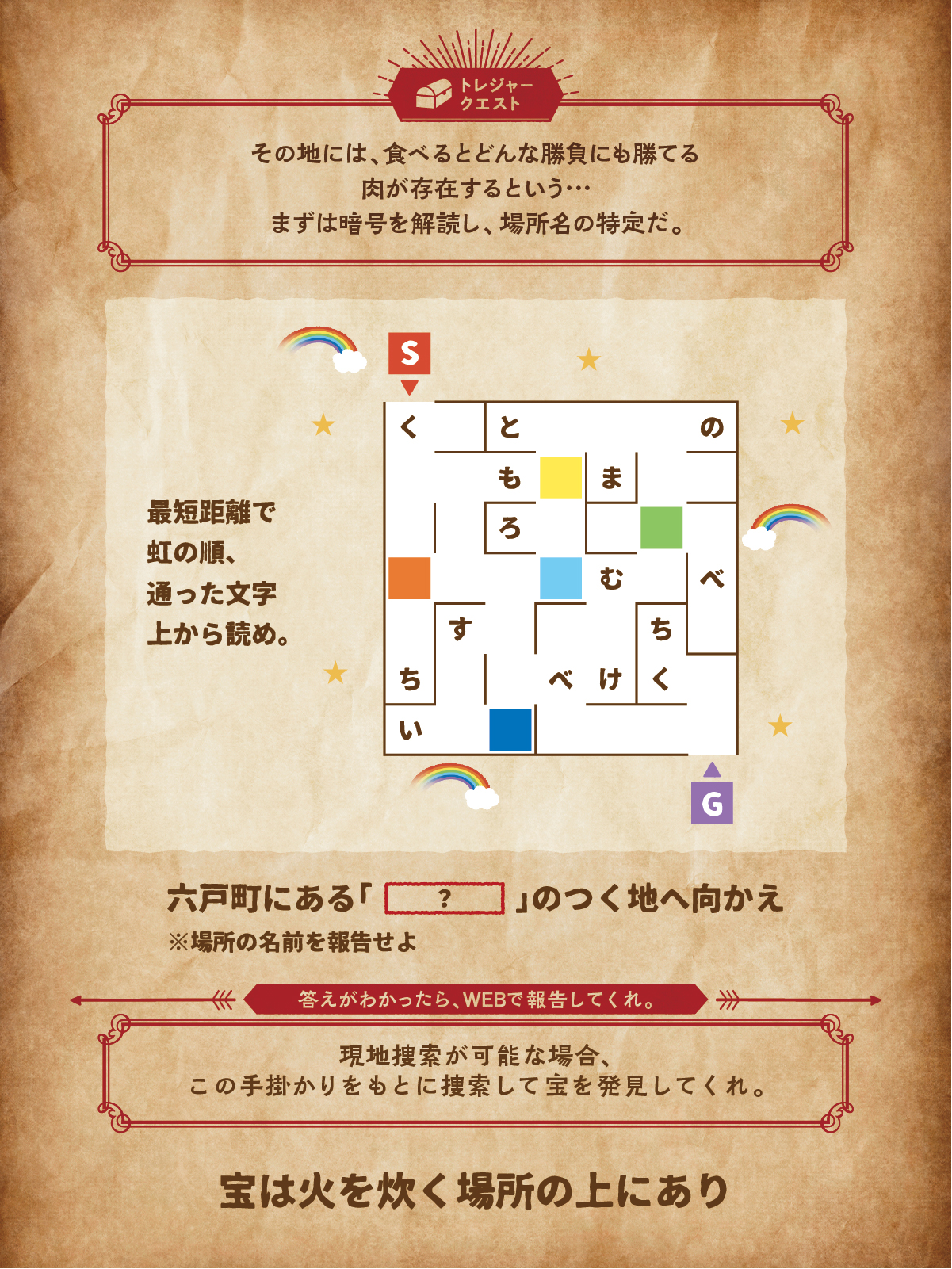 暗号を解読し、「場所の名称」を突き止めよう!現地に行くことが出来ない場合、場所の名称を報告してクエストクリア!