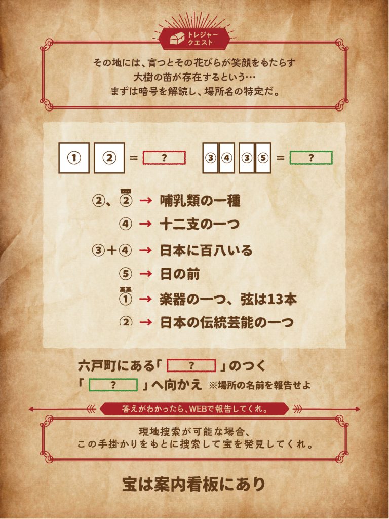 暗号を解読し、「場所の名称」を突き止めよう!現地に行くことが出来ない場合、場所の名称を報告してクエストクリア!