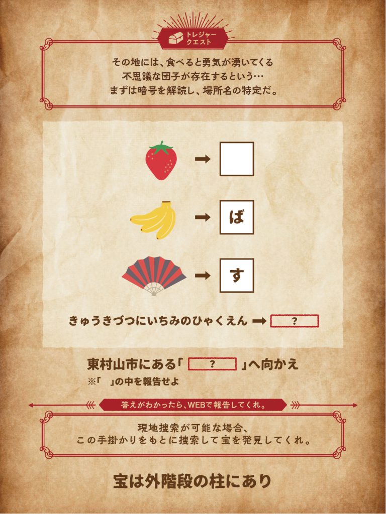 暗号を解読し、「場所の名称」を突き止めよう!現地に行くことが出来ない場合、場所の名称を報告してクエストクリア!