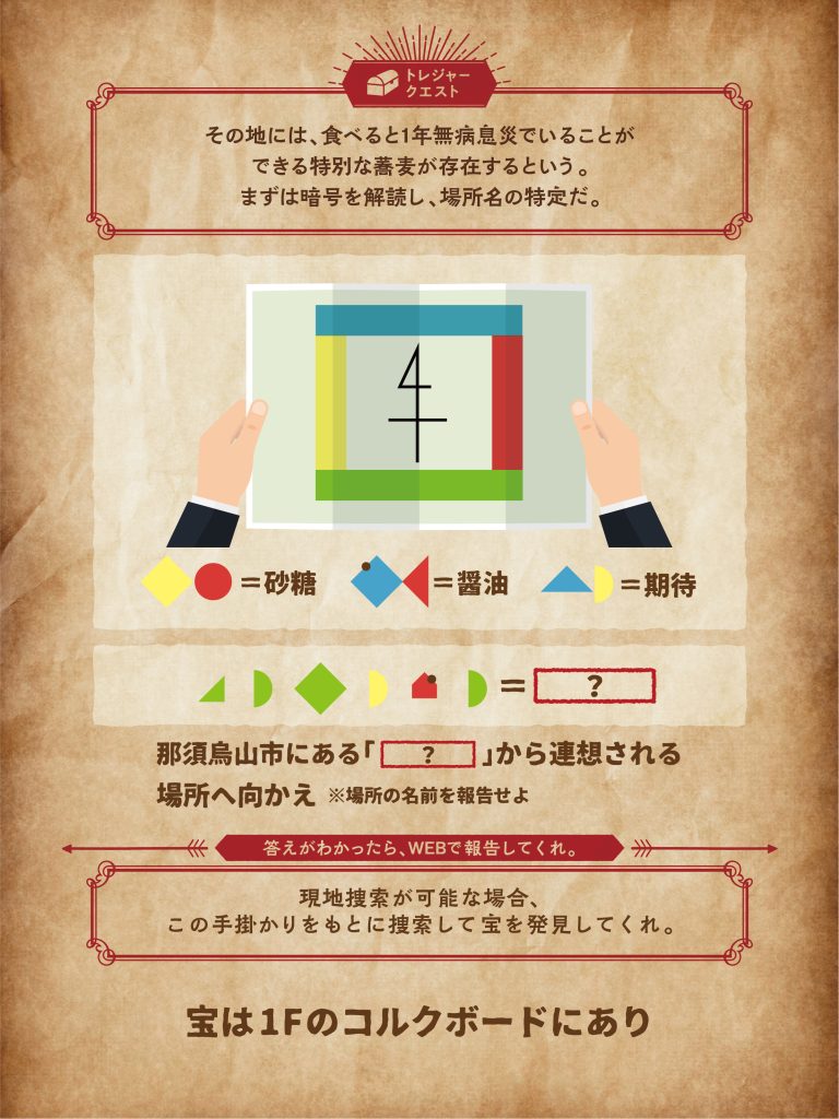 暗号を解読し、「場所の名称」を突き止めよう!現地に行くことが出来ない場合、場所の名称を報告してクエストクリア!