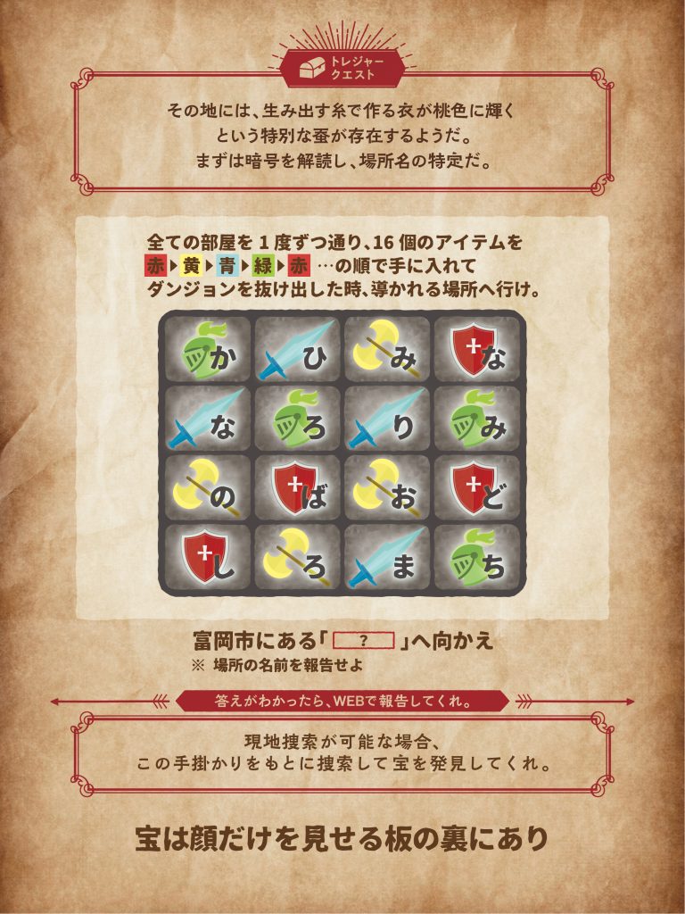 暗号を解読し、「場所の名称」を突き止めよう!現地に行くことが出来ない場合、場所の名称を報告してクエストクリア!