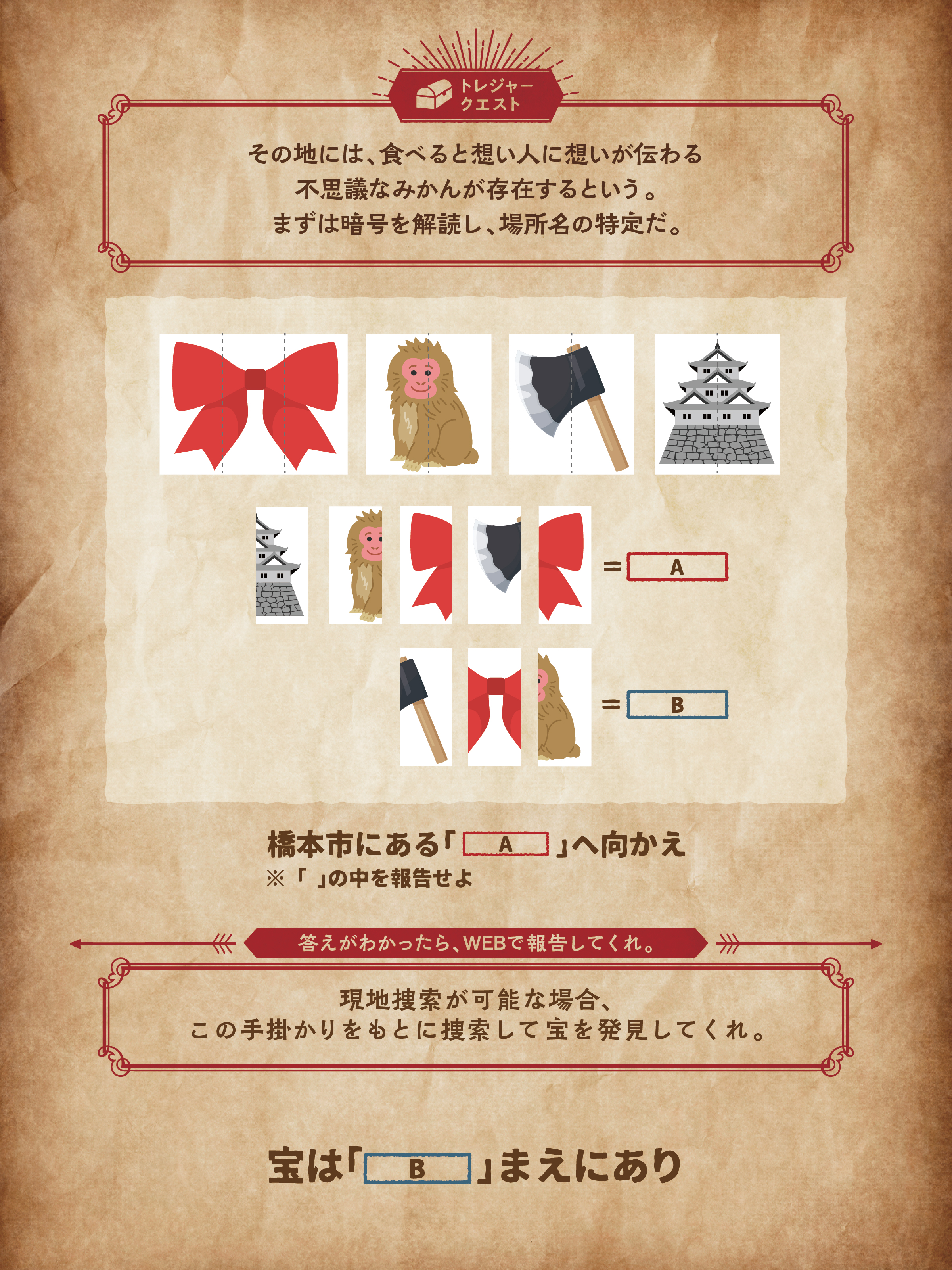 現地捜索が可能な場合、この手掛かりをもとに捜索して宝を発見してくれ!