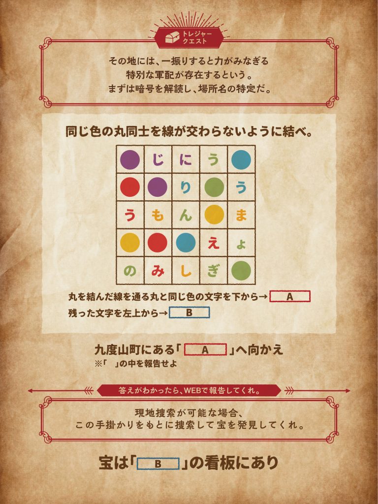 暗号を解読し、「場所の名称」を突き止めよう!現地に行くことが出来ない場合、場所の名称を報告してクエストクリア!