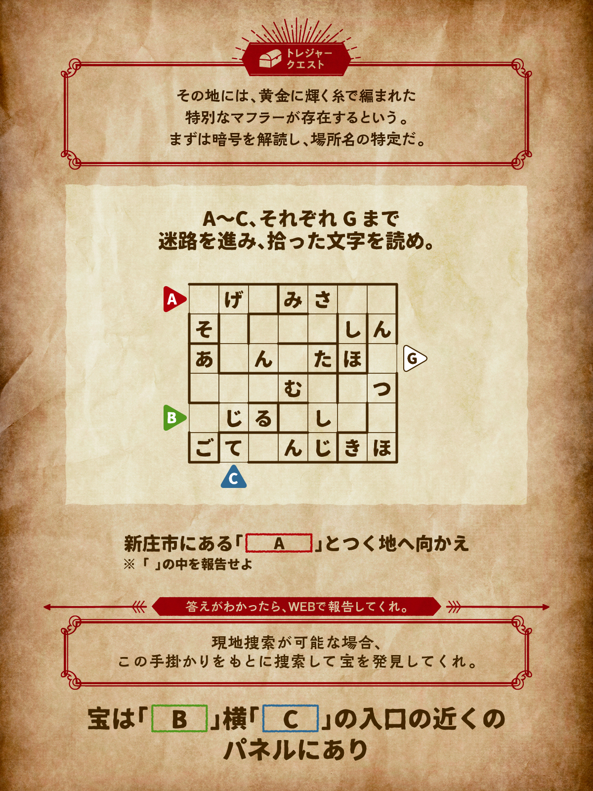 ・万が一、宝のパネルが紛失等により発見できなかった場合は、必ず隠し場所と思われる箇所の写真を撮影いただきカスタマーサポートまでご連絡ください。