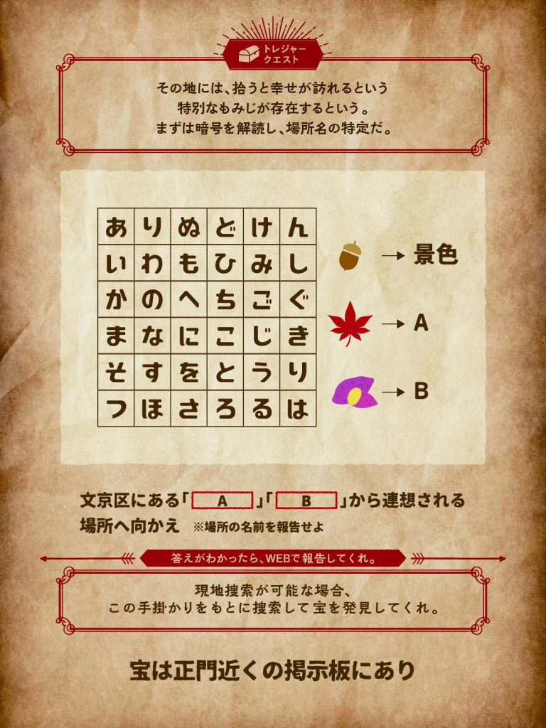 暗号を解読し、「場所の名称」を突き止めよう!現地に行くことが出来ない場合、場所の名称を報告してクエストクリア!