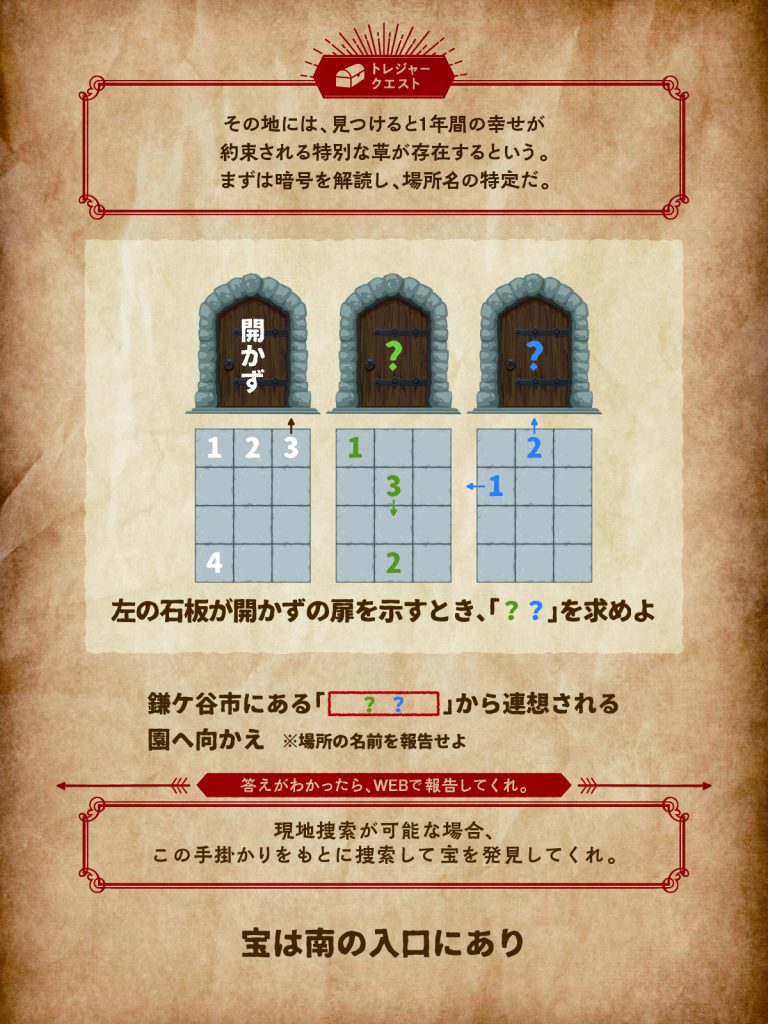 暗号を解読し、「場所の名称」を突き止めよう!現地に行くことが出来ない場合、場所の名称を報告してクエストクリア!