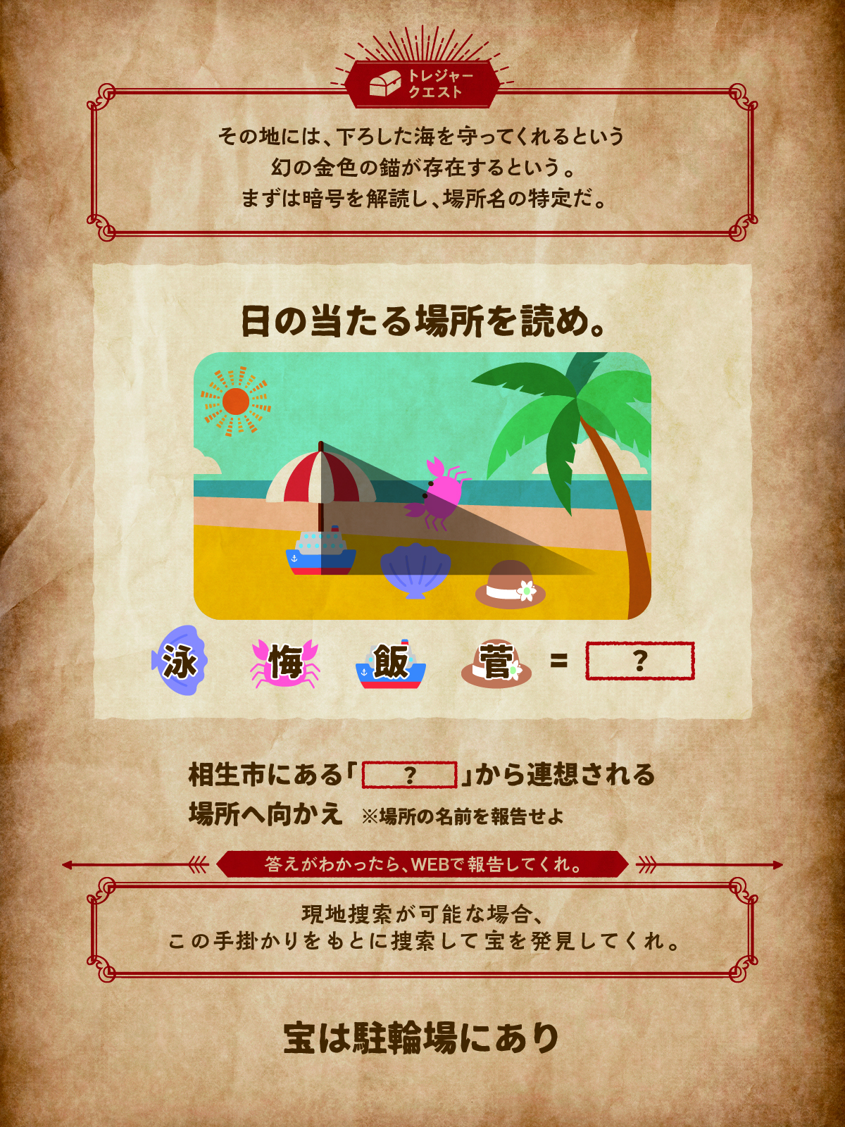 現地捜索が可能な場合、この手掛かりをもとに捜索して宝を発見してくれ!