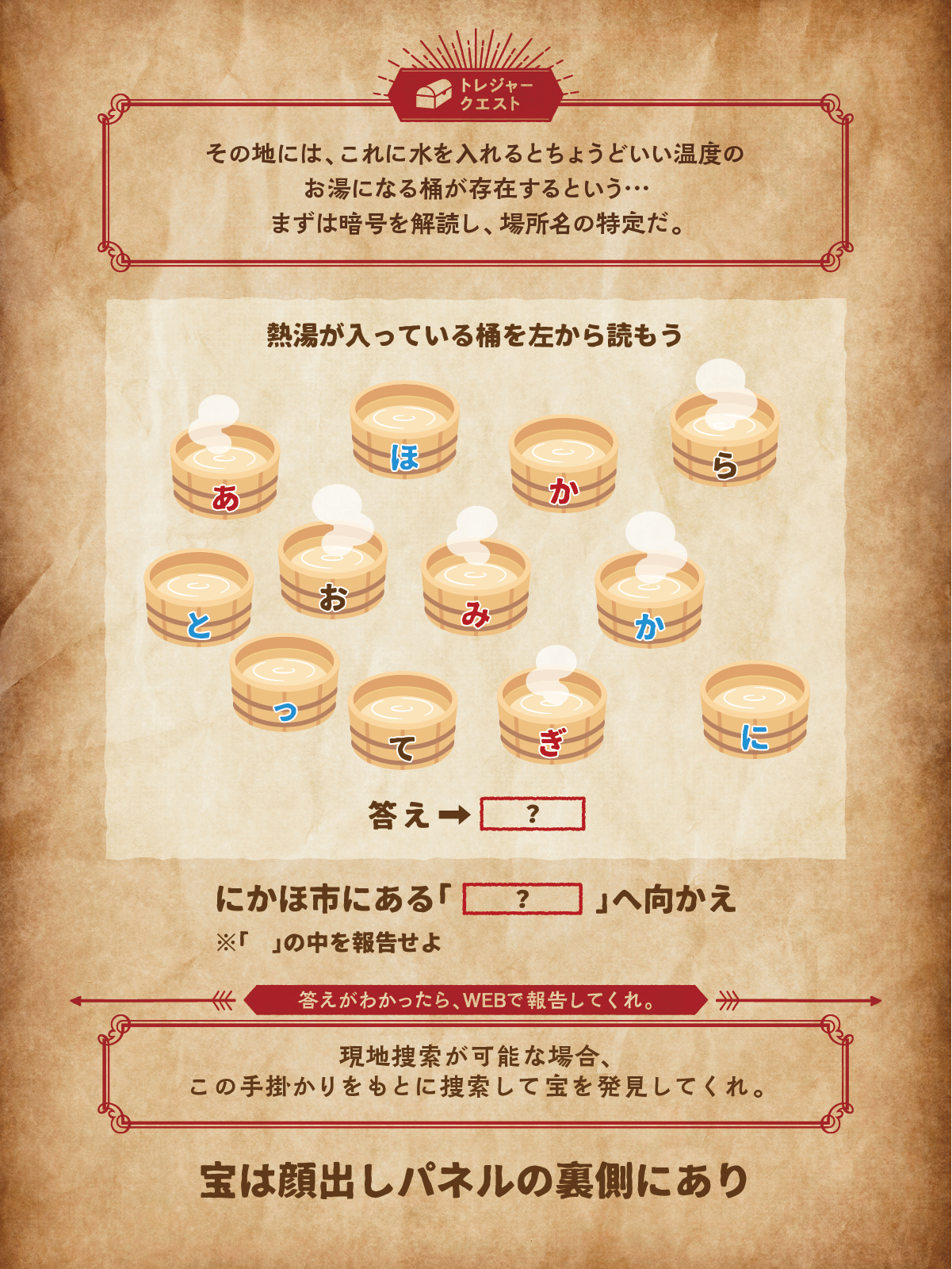 暗号を解読し、「場所の名称」を突き止めよう!現地に行くことが出来ない場合、場所の名称を報告してクエストクリア!