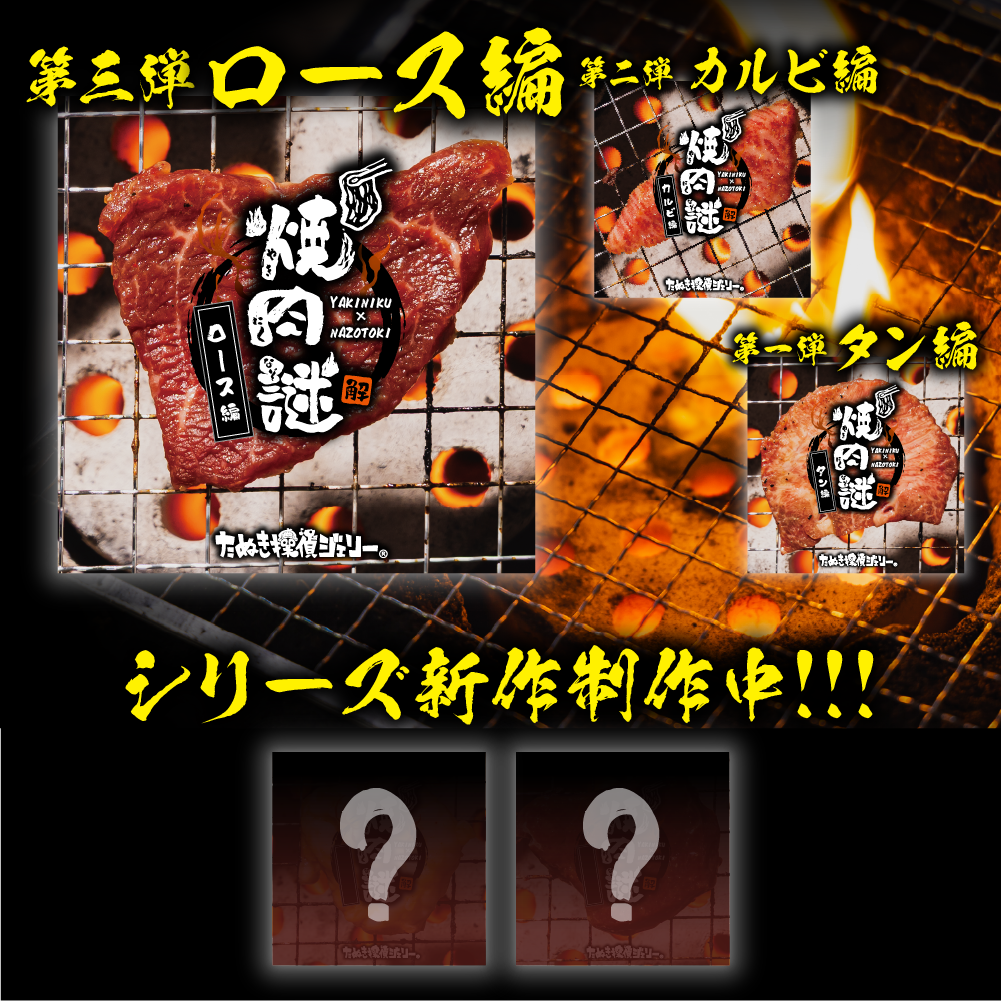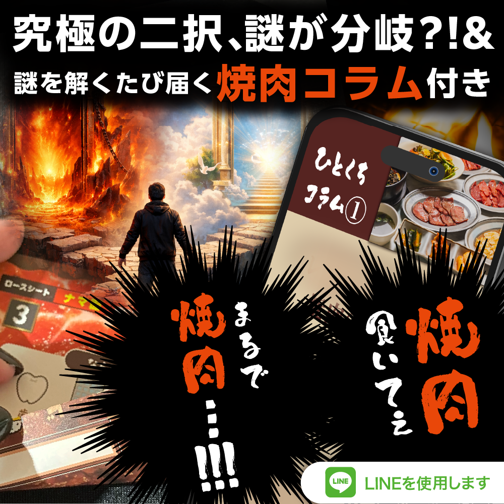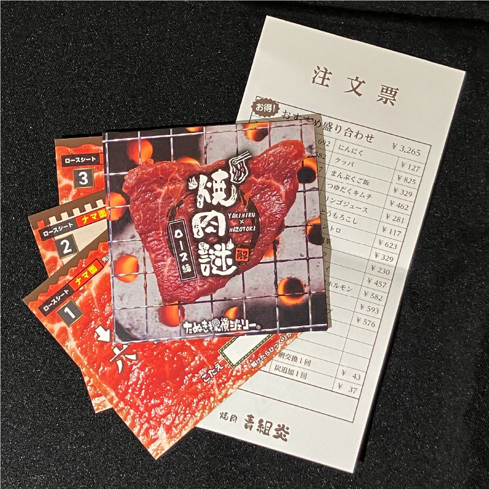 焼肉をテーマにした、LINEを使用する持ち帰り謎シリーズ。 肉を“焼く”ように、謎を“解いていく”体験を楽しめます。 謎には「赤い面」と「茶色い面」の2面があり、答えを送信すると焼肉コラムが届く! 解いた後にはプレイ時間に応じて“焼き加減”を評価する得点表付き。初級者〜上級者まで楽しめます。