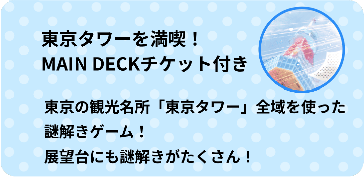 ◆ヒントや手がかりを、会場スタッフや東京タワースタッフへお尋ねいただくことはご遠慮ください。 また、ヒントや答えに関する個別のお問い合わせには対応いたしかねます。