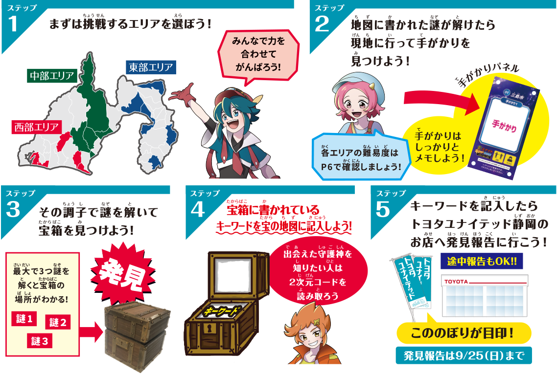 このイベントは、宝の地図に描かれた謎を解き明かしながら、静岡県内15エリアに隠された宝箱のありかを見つけ出す体験型のリアル宝探しゲームです。 発見したキーワードをトヨタユナイテッド静岡の店舗で報告すると豪華賞品が当たる抽選に応募できるよ!